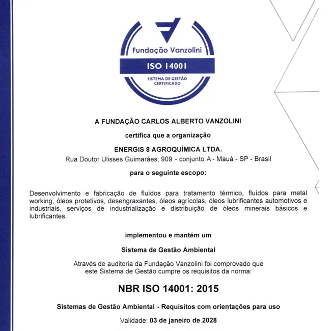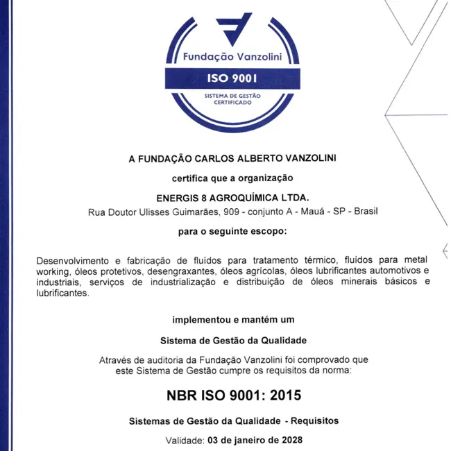Commitment to quality, safety and rigor. The Energis 8 Brasil Group has the ISO 14001 and ISO 9001 certifications, thus meeting the highest standards and market requirements. See the certifications below.